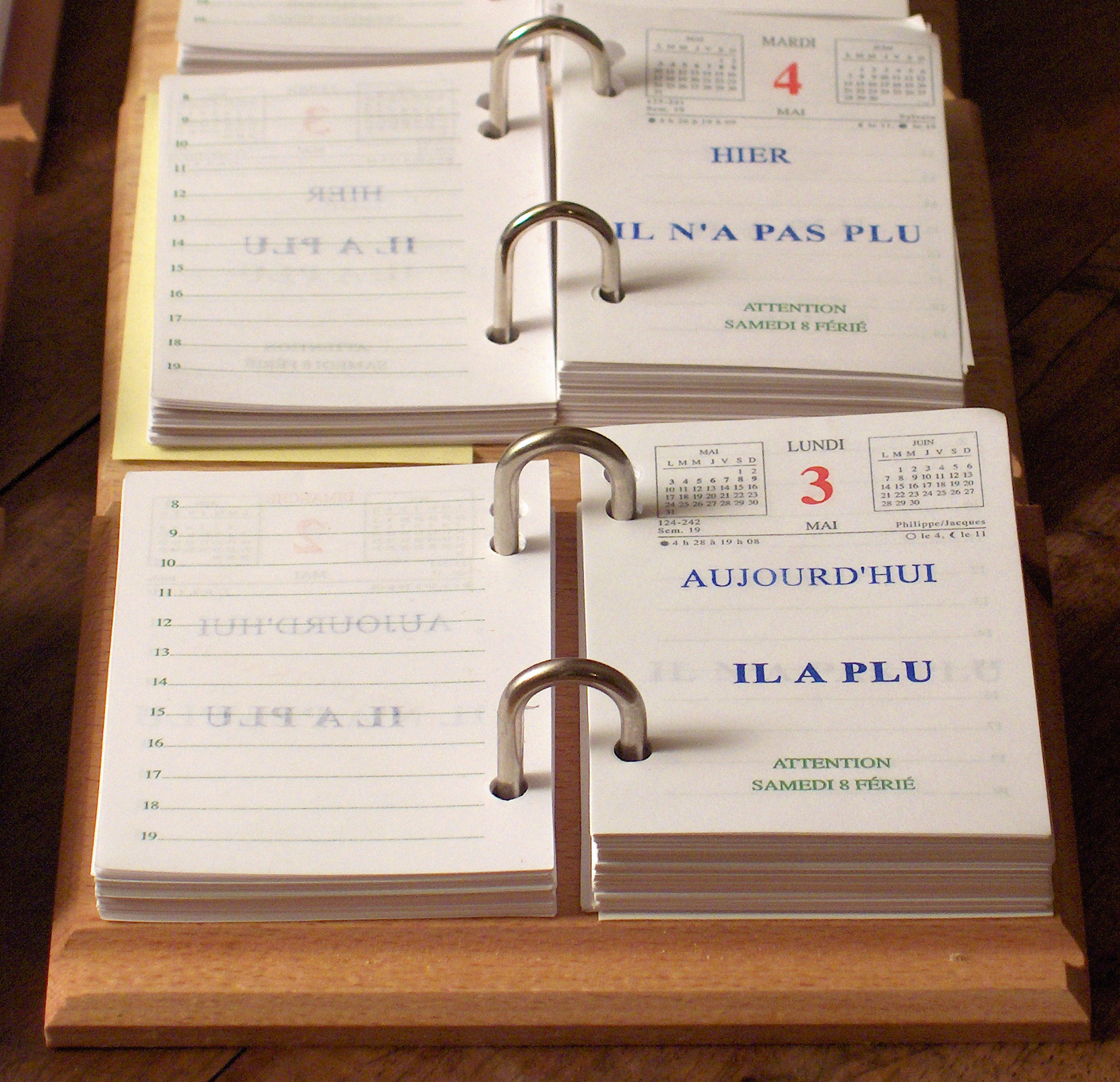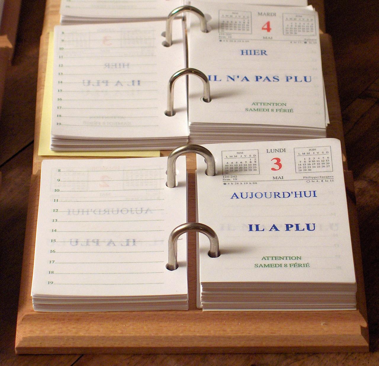 « Achevée » le 30 avril 2004, La Sculpture : les Pluies se poursuit sous d’autres formes, par exemple un Échiquier des Pluies au domicile de l’artiste ou encore les Éphémérides des Pluies : jour après jour l’artiste use de tampons encreurs (« Il a plu » / « Il n’a pas plu ») sur un ensemble de trois blocs-agendas titrés « Hier », « Aujourd’hui » et « Demain ».