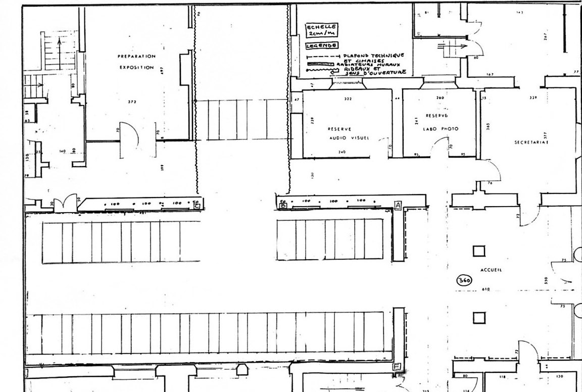 La perception d’ensemble de cet espace sculptural n’est possible que par le jeu de va-et-vient de la galerie (où l’allée centrale va buter sur le mur du fond) à la salle de projection (dans laquelle à contrario les plateaux coupent le passage), permettant au seul regard d’aller à travers l’espace libre jusqu’au mur blanc du fond.