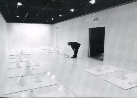 Un espace de 30 cm sépare les plateaux sur chacun desquels est posé un groupe de trois cônes en plâtre et résine, répété 23 fois, le tout badigeonné de peinture blanche.