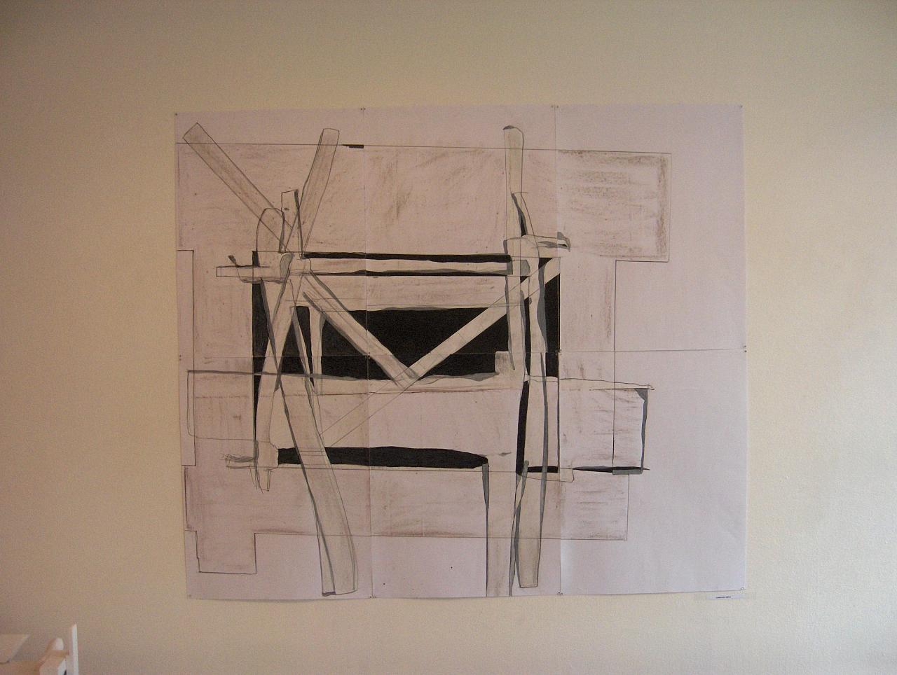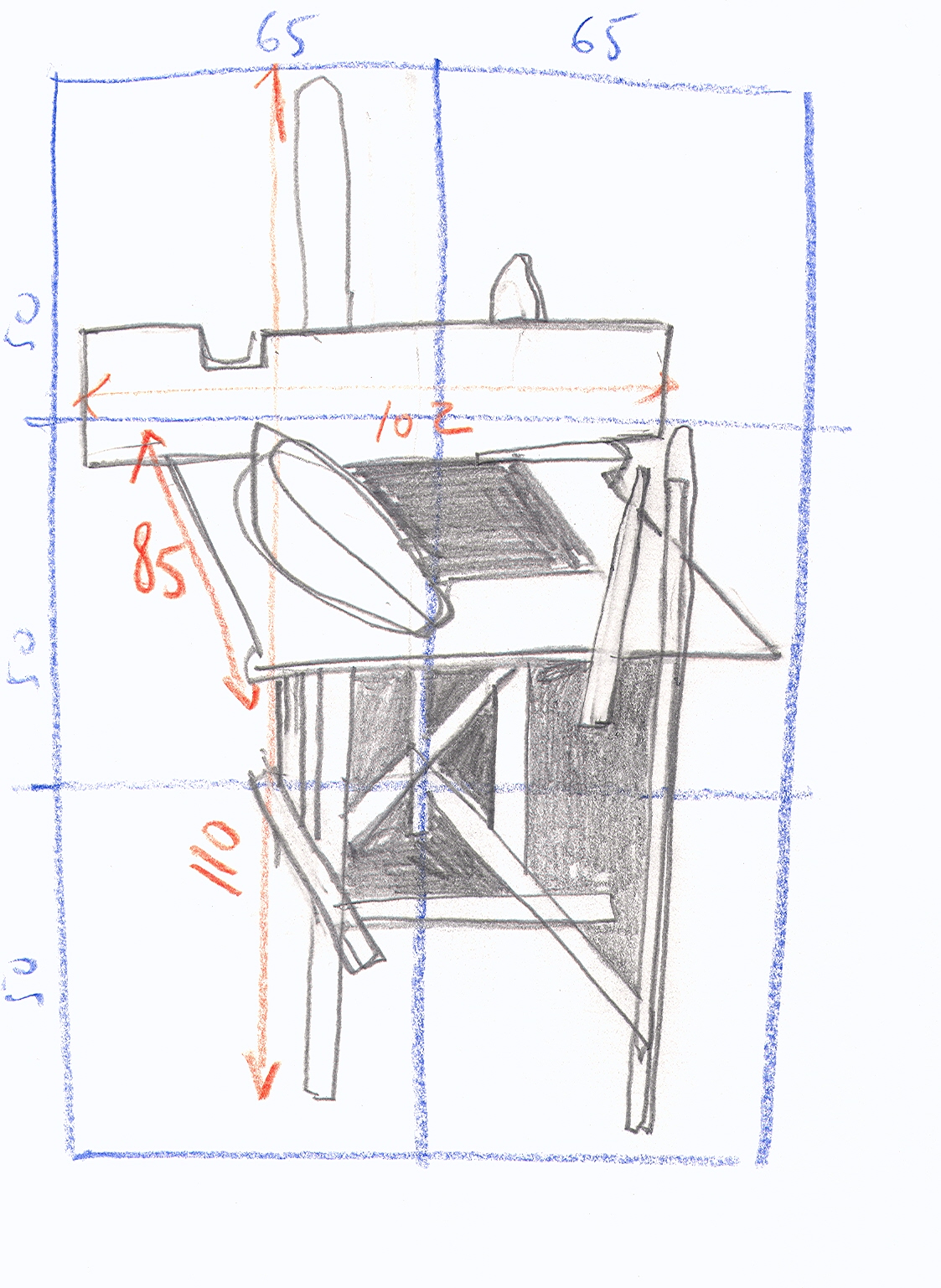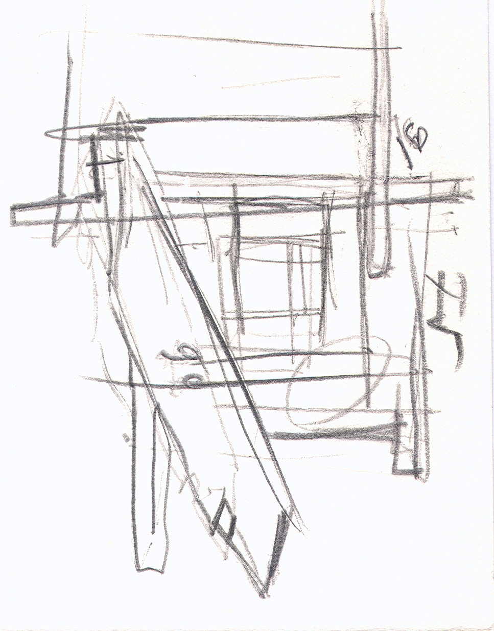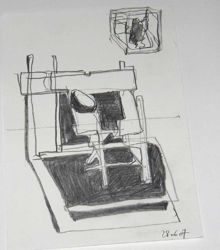 Construction sur table, étudeCrayon graphite sur papier, 10 × 15 cm.