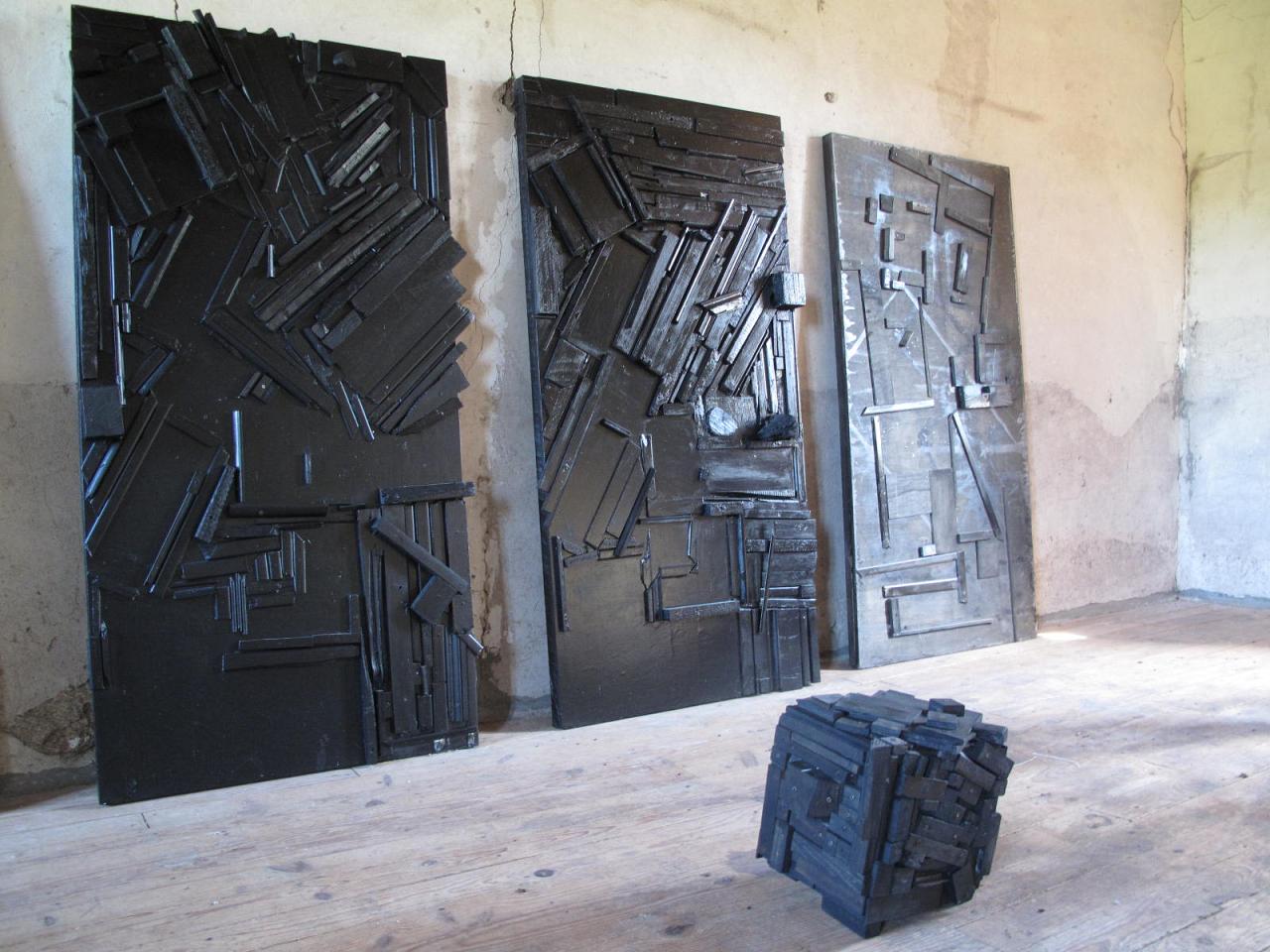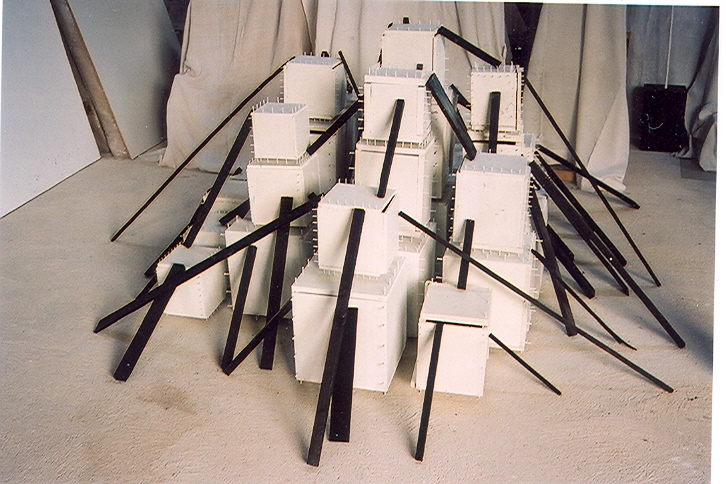 Grands & Petits bois Sculptures Petits bois N° 2, 3, 5 Petits bois, assemblés, teintés à l’encre de Chine. N° 3 Petits bois, assemblés, teintés à l’encre de Chine, 21 × 21 × 21 cm. N°5 Petits bois, assemblés, teintés à l’encre de Chine, 21 × 21 × 21 cm. Chute d’Icare Bois assemblés, peinture. Dimension variable. Petits bois, Grands bois & Atopiques Installation à la Maison des pluies, Châtenet, Creuse. Manhatan Bois assemblés, encre de Chine. 75x150x 100cm Cadastre, Petits bois, Atopiques Bois assemblés, peints. Installation à la Maison des pluies Châtenet, Creuse. 4 Cadastres Bois assemblés, peints. 75 × 150 cm chaque. Cadastre & Petits bois Bois assemblés, peints. 75 × 150 cm chaque au mur & 21 × 21 × 21 cm au sol.