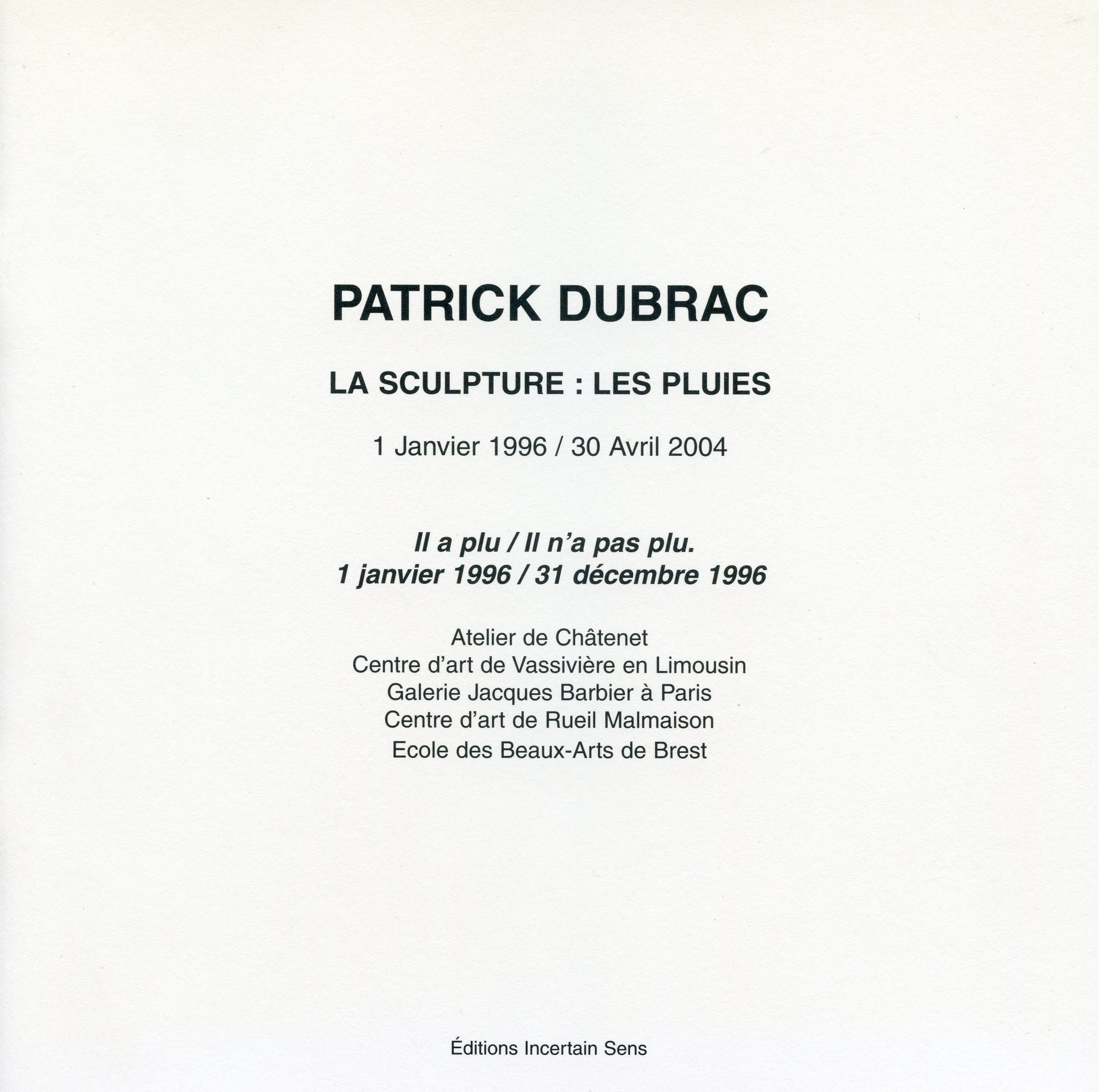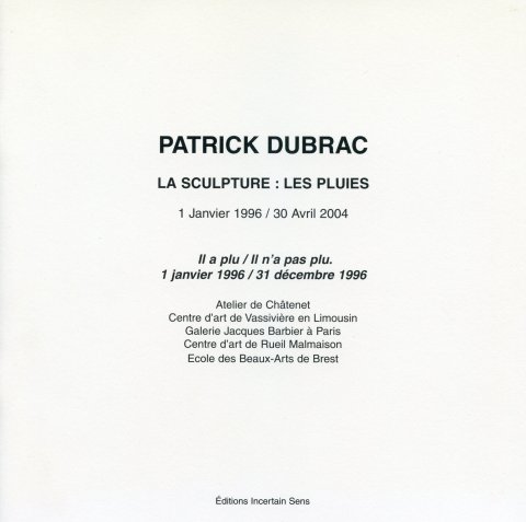 « La Sculpture : les pluies » 1 janvier 1996/31 décembre 1996, volume 1 a été publié par les éditions Incertain Sens Université Rennes 2 à 1000 exemplaires aux Impressions du Sagittaire à Cesson Sévigné dépot légal mars 2003