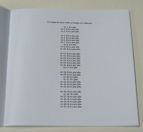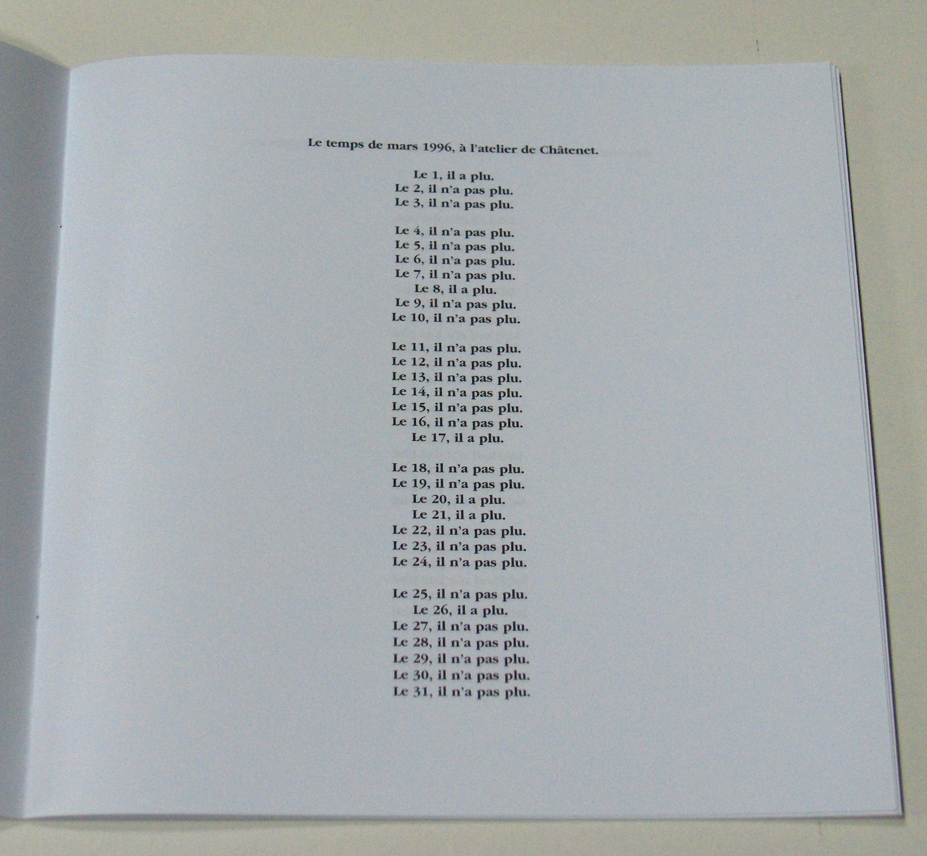 Édité à 1000 exemplaires par les éditions Incertain Sens en 2003, ce livre d’artiste dresse mois après mois et jour après jour l’inventaire de la pluviométrie à l’atelier de l’artiste à Châtenet en Creuse, au Centre d’art de l’île de Vassivière, à la galerie Barbier-Betz, au Centre d’art de Rueil-Malmaison ainsi qu’à l’École des beaux-arts de Brest.