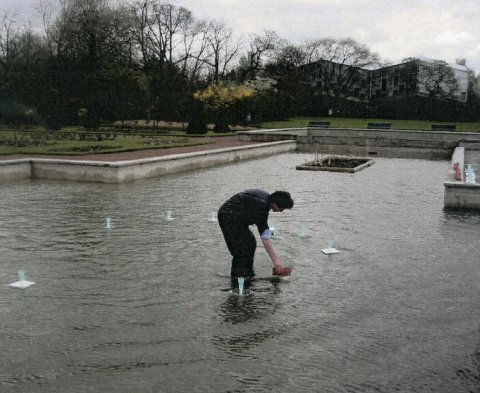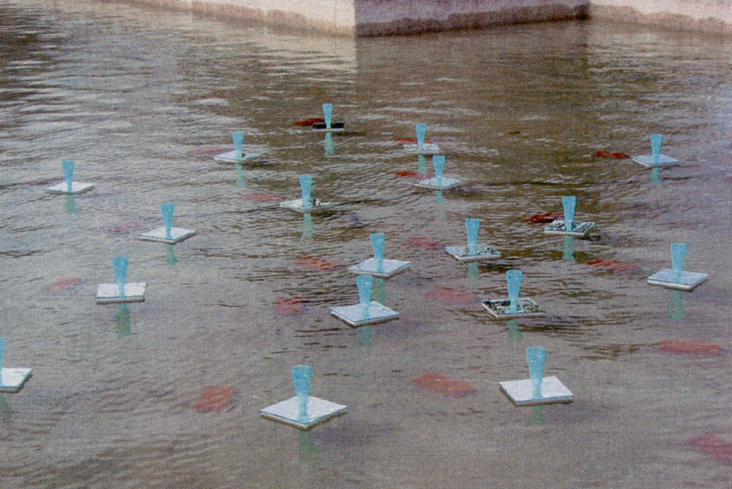 • 30 pluviomètres flottants sur le bassin du jardin botanique pour Artconnexion avril 2004
