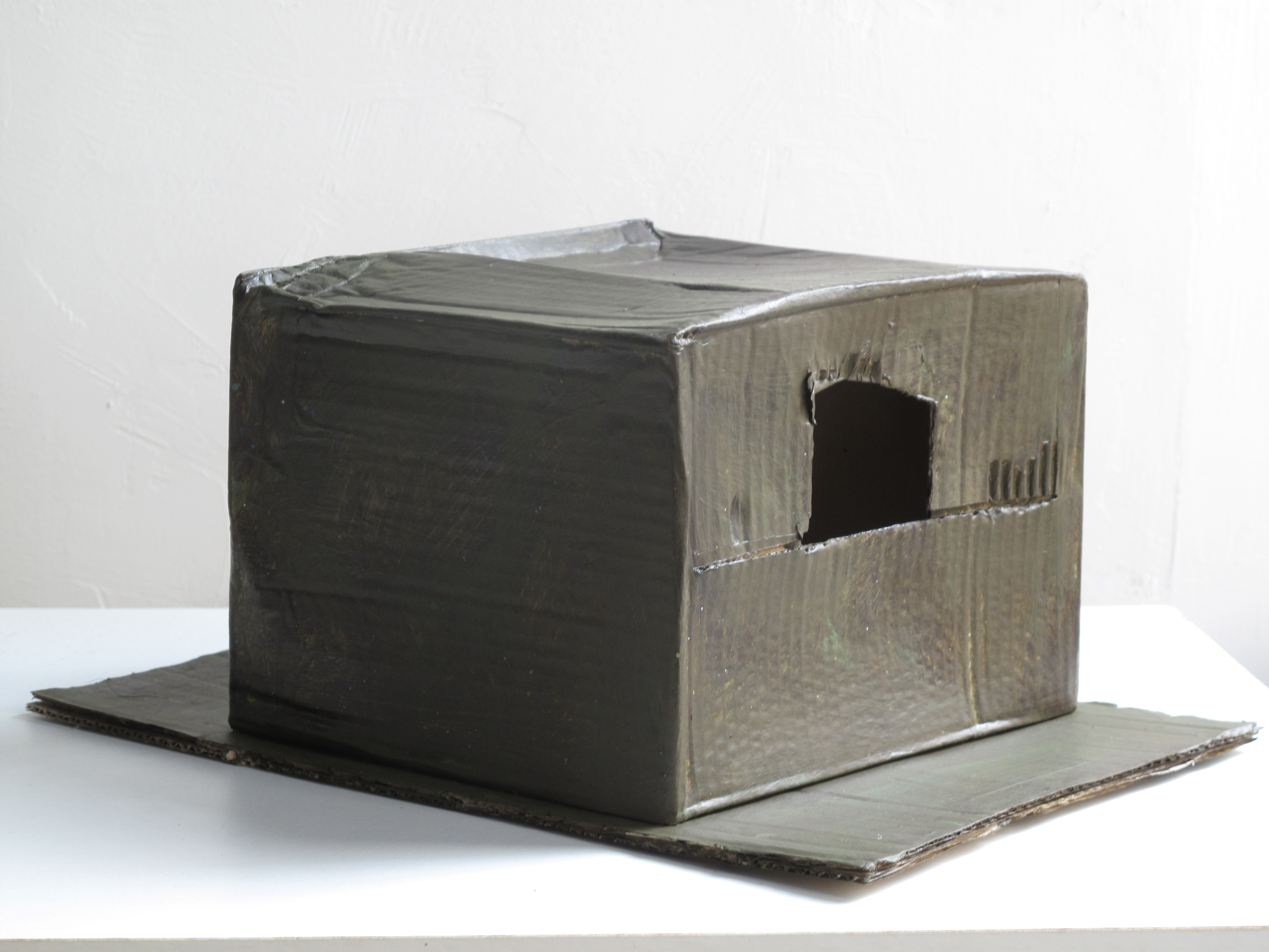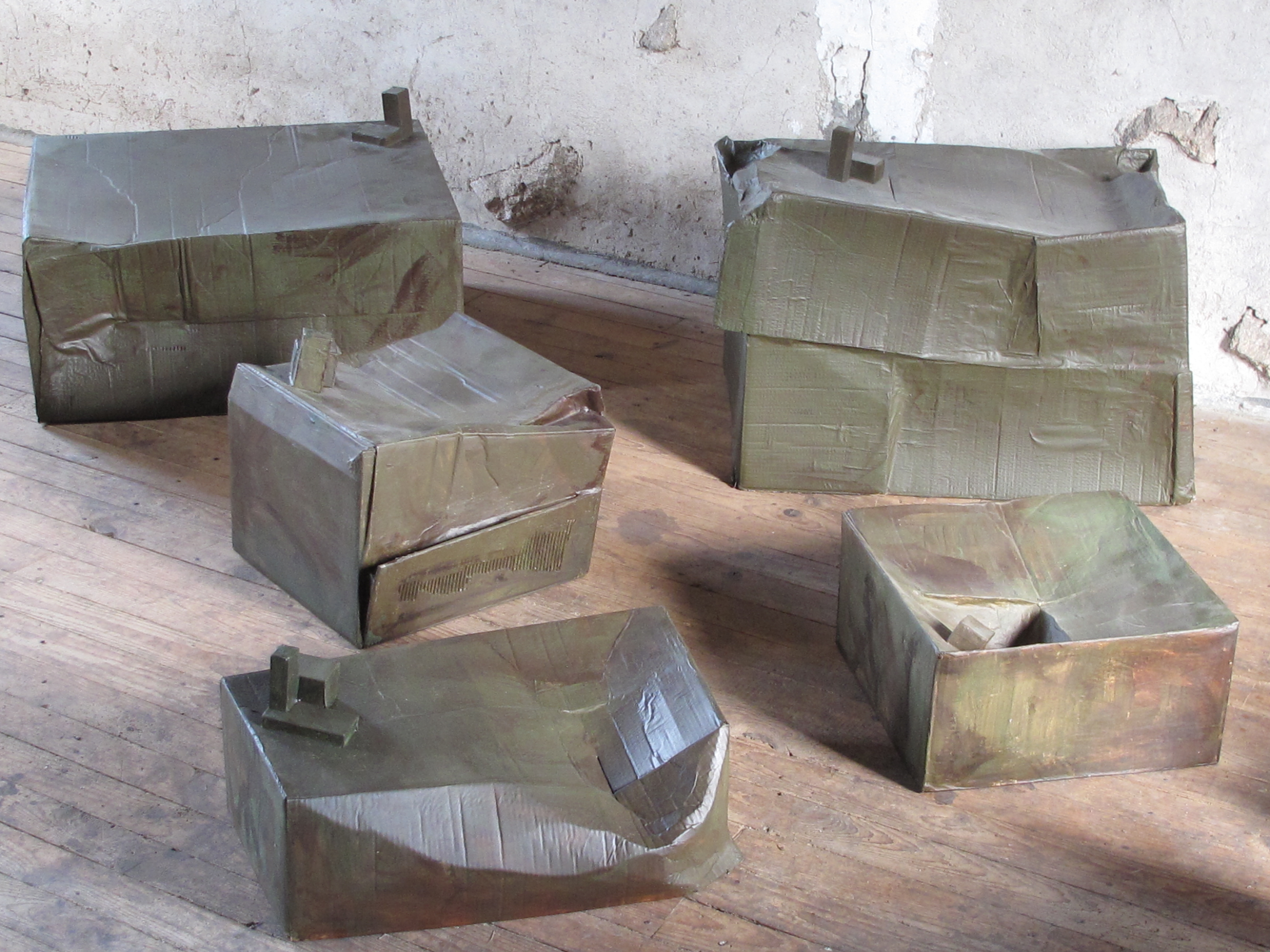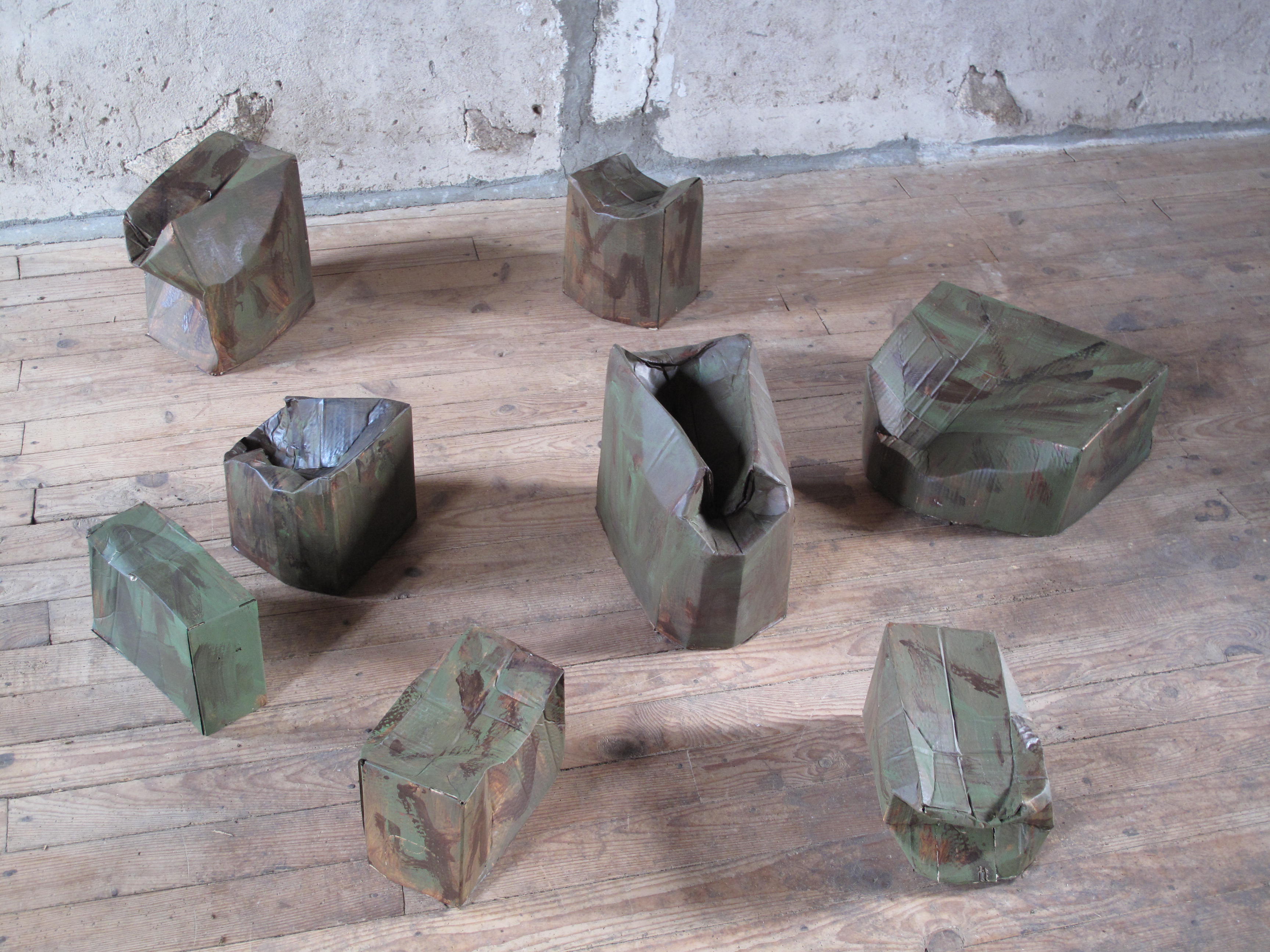 Les formes en carton peintes à l’acrylique afin de recouvrir tout ce qui pourrait en gêner la lecture(impressions, étiquettes etc… ) sont disposées au sol. Investies de la fonction de sculpture elles suggèrent des paysages de ruines abandonnées, inhabitables, dévastées par la guerre, la pollution, les catastrophes naturelles.