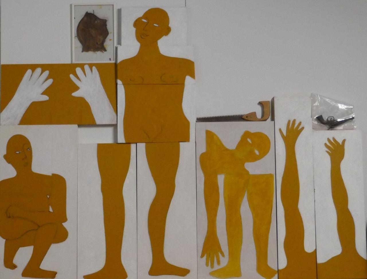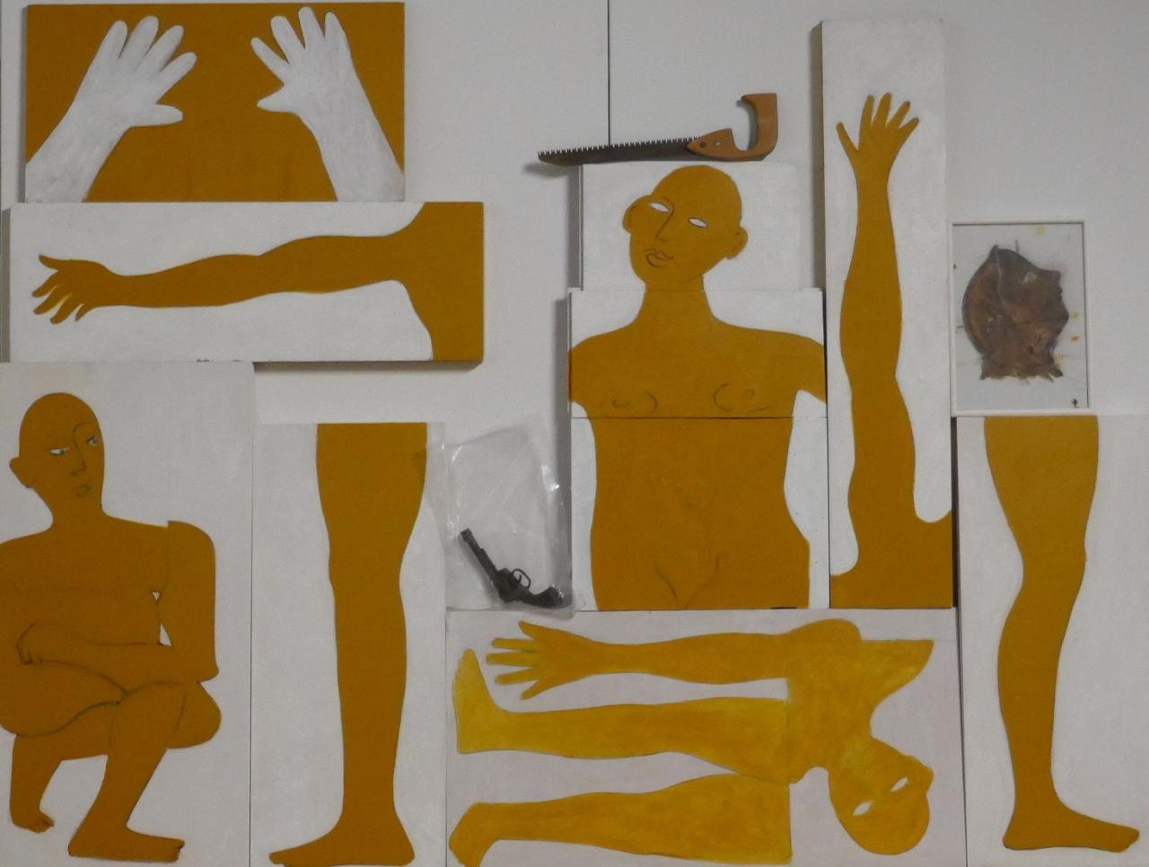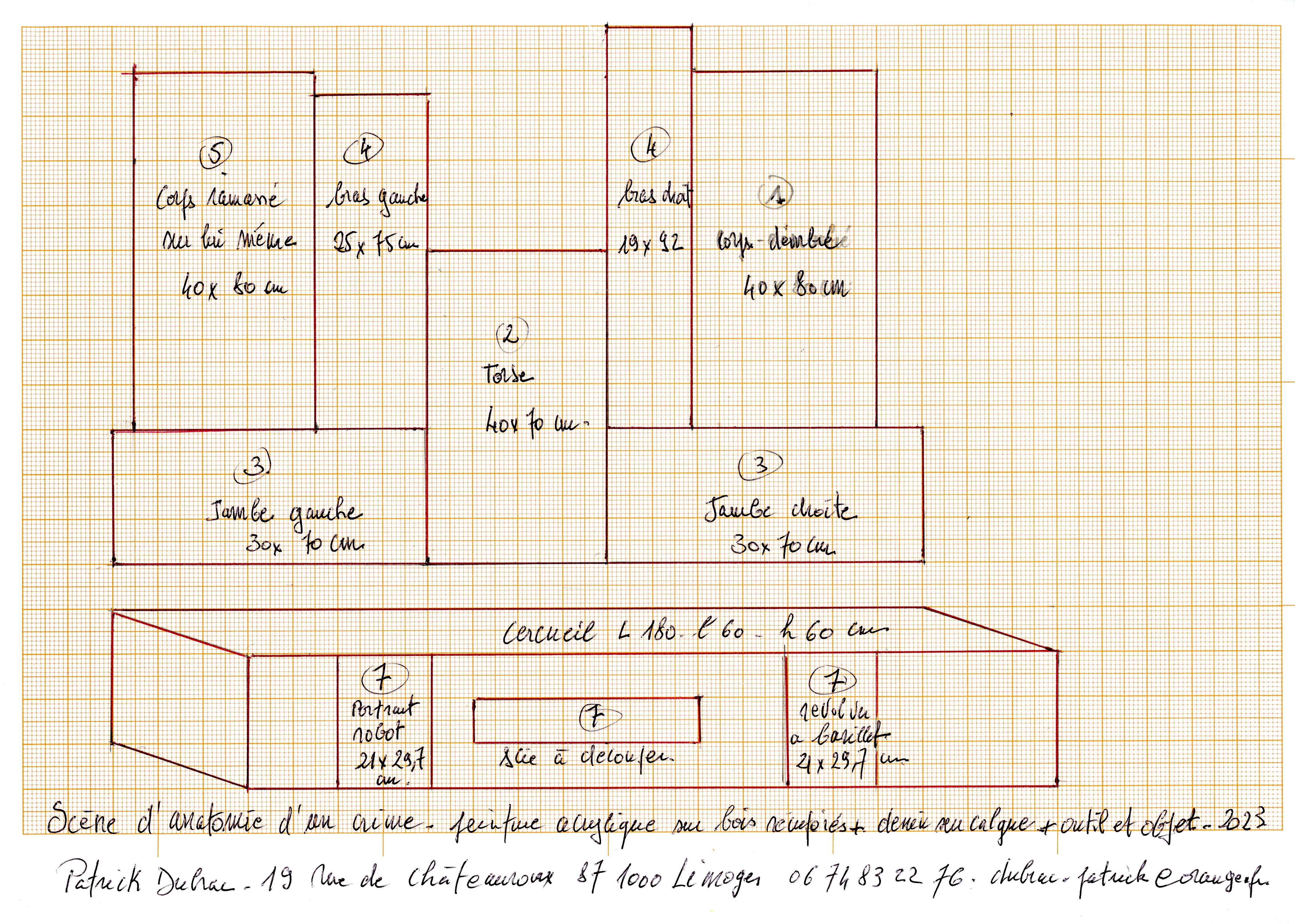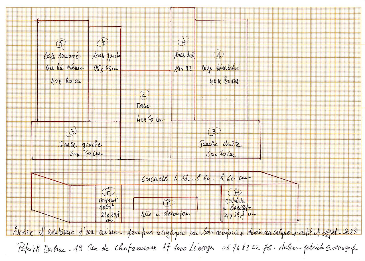 Scène de crime les Ex-votos Peintures ex-voto Scène de crime ex-voto le corp accroupi Acrylique sur panneau Tavola, 40x80 cm, 2023/24 Scène de crime ex-voto la jambe droite acrylique sur bois, ..x.. cm, 2023/24 Scène de crime ex-voto la jambe gauche Acrylique sur bois, ..x.. cm, 2023/24 Scène de crime ex-voto le bras droit acrylique sur bois,..x.. cm, 2023/24 Scène de crime ex-voto le bras gauche acrylique sur bois, ..x..cm, 2023/24 Scène de crime ex-voto le corps démembré peinture acrylique sur panneau Tavola, 40x80 cm 2023/24 Scène de crime ex-voto le torse Peinture acrylique sur bois assemblé, ..x..cm, 2023/24 Scène de crime shéma d’installation Shéma de montage de l’instalation de la Scène de crime crayon à bille sur papier millimétré, 21x29,7 cm 2023/24 Scène de crime troisième installation Fragments de corps peint sur bois les différents Ex-Votos sont assemblés contre un mur, dimensions variables ; 2023/24 Scène de crime deuxièmes installation Fragments de corps peint sur bois les différents Ex-Votos sont assemblés contre un mur, dimensions variables ; 2023/24 Scène de crime première installation Fragments de corps peint sur bois les différents Ex-Votos sont assemblés contre un mur, dimensions variables ; 2023/24 Scène de crime portrait robot du suspect Lavis d’encre brune sur papier calque, 21x29,7 cm, 2023 Également dans ex-voto 2024 Les Incarnats