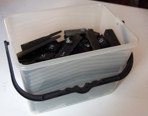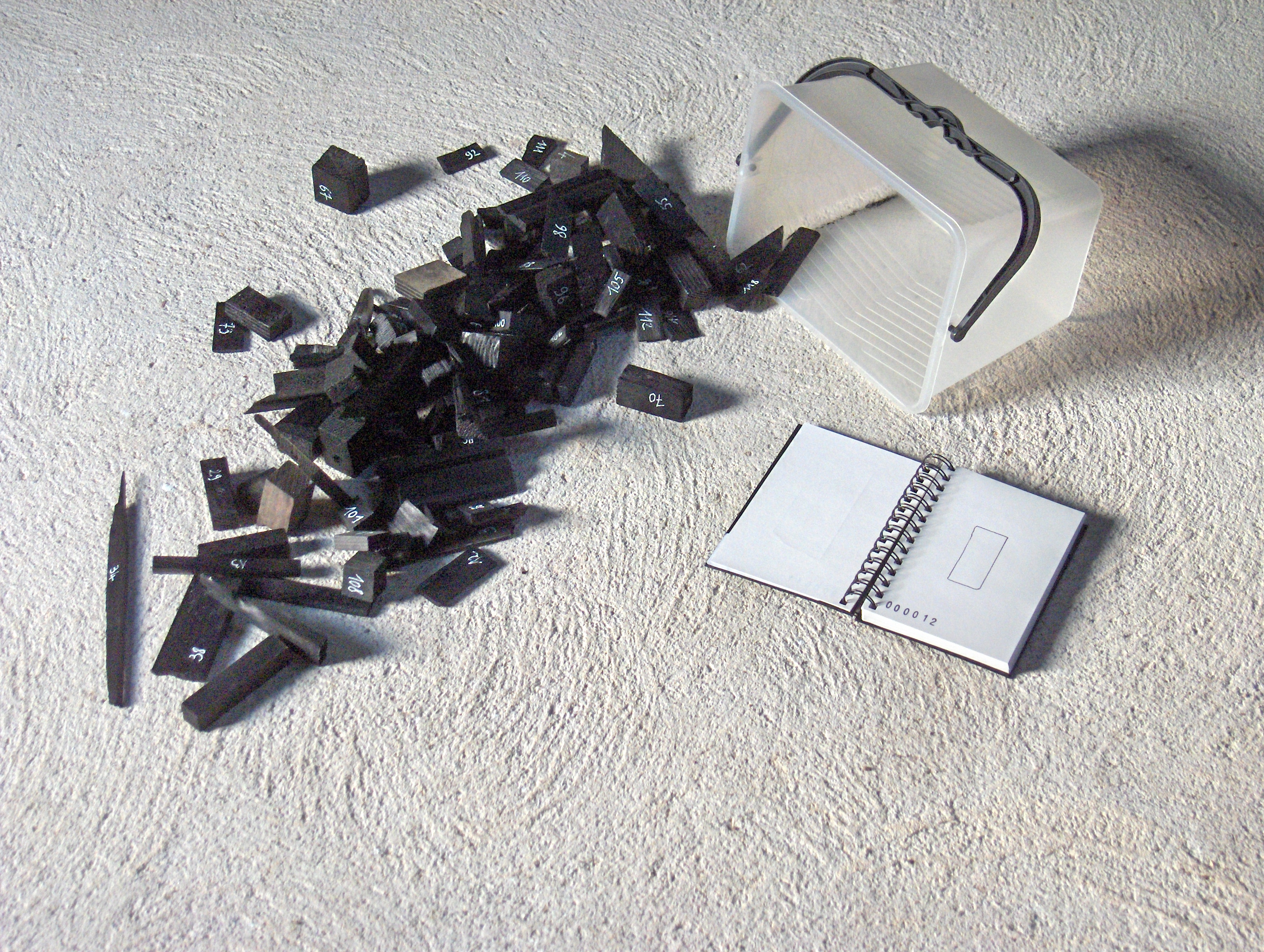 « Série noire » est composée d’un ensemble de fragments, chutes, restes de petits bois, trouvés dans la rue, récupérés dans l’atelier, teintés à l’encre de Chine, numérotés, et rangés dans un camion à peinture en matière plastique translucide de couleur blanche, muni d’ une poignée noire.